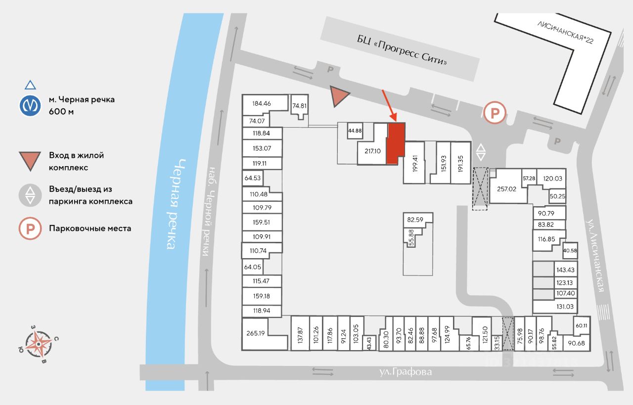 Вокруг плотная застройка: ЖК Ривьер Нуар, ЖК Риверсайд, ЖК Белый остров, ЖК Домино, ЖК Лисичанская 22, ЖК ЦДС Черная речка,а также множество бизнес-центров - 28 000+ жителей и более 11 000 сотрудников офисных и бизнес-центров.