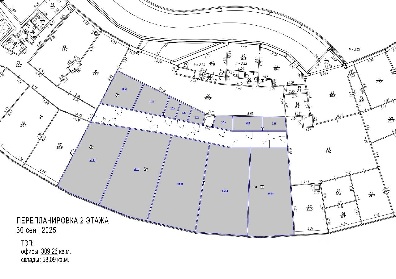 Офисные помещения: 53,8 м2, 64,63 м2, 63,86 м2,66,58м2,60,36 м2 - ставка 1400 руб./м2. За все помещения - ставка 1100 руб./м2.