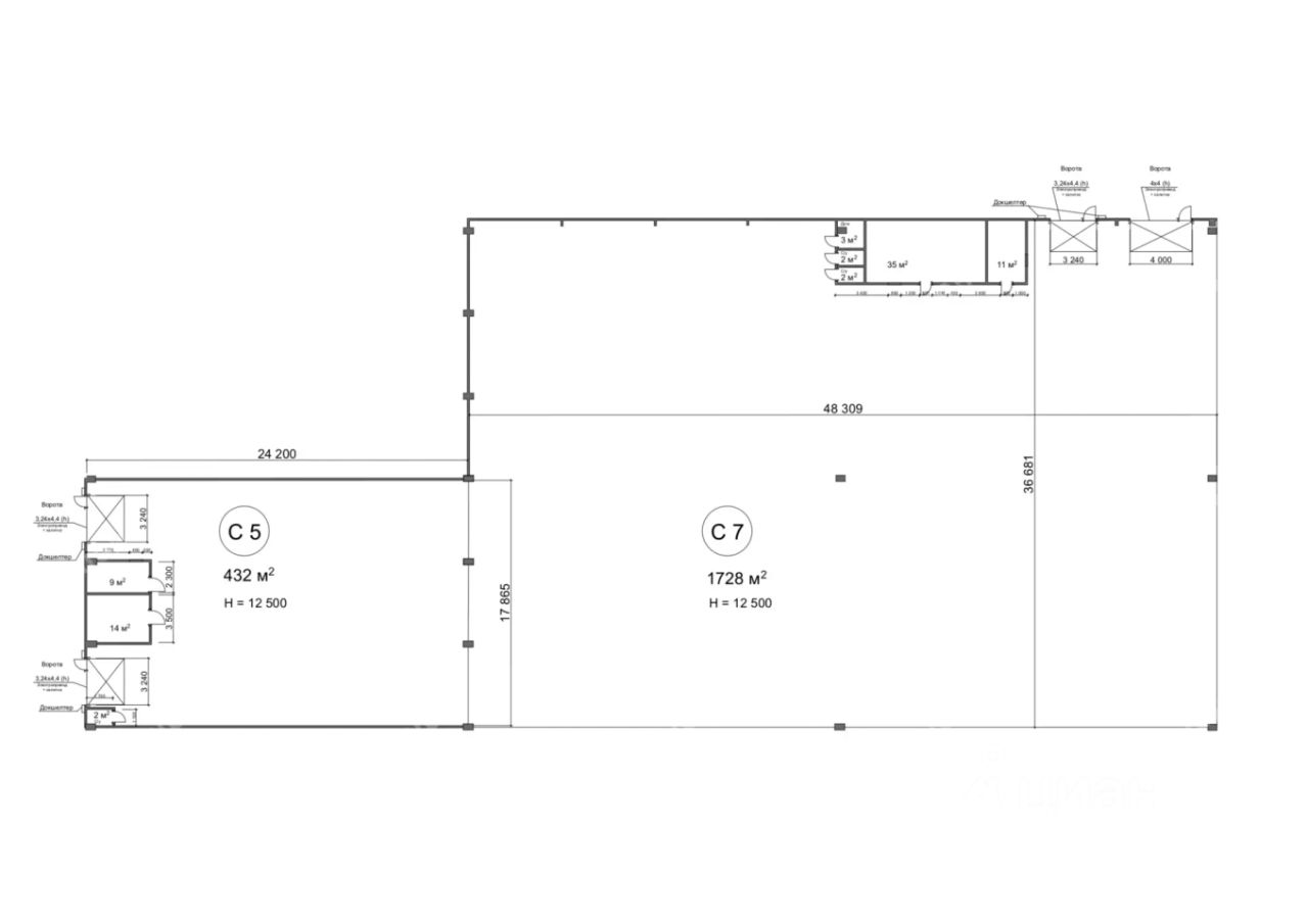 - Высота потолков: 12.5 м;