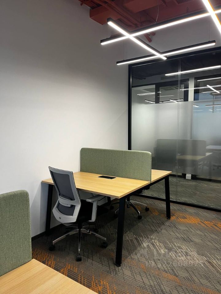 - Полное мебельное оснащение - рабочие столы с электро-подключением и СКС, эргономичные рабочие кресла,