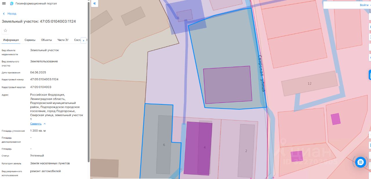 Земельный участок из земель населенных пунктов, с кадастровым номером 47:05:0104003:1124, площадью 1200 кв.м. расположенного по адресу: Ленинградская область, Подпорожский муниципальный район, Подпорожское городское поселение, город Подпорожье, улица Свирская, земельный участок 1, с видом разрешенного использования: "ремонт автомобилей". Срок аренды 30 месяцев со дня заключения договора.