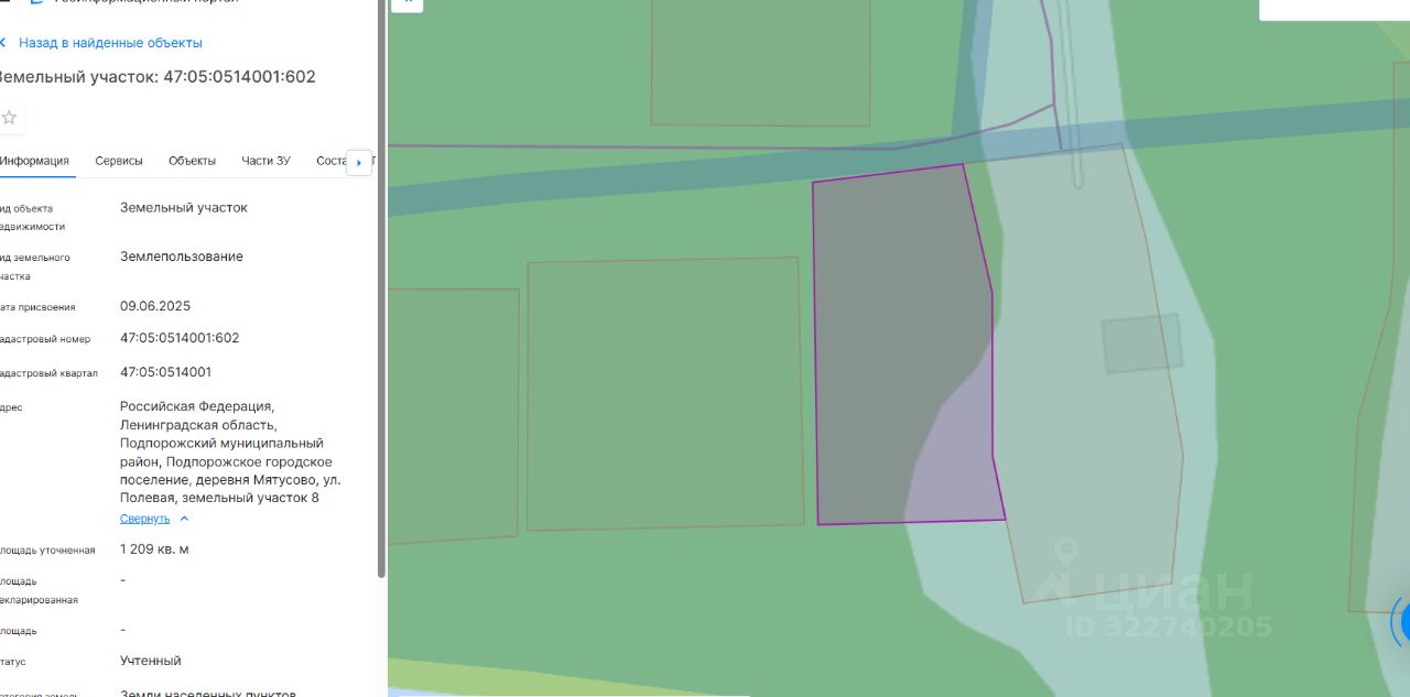 Земельный участок из земель населенных пунктов, с кадастровым номером 47:05:0514001:602, площадью 1209 кв.м. расположенного по адресу: Ленинградская область, Подпорожский муниципальный район, Подпорожское городское поселение, д. Мятусово, ул. Полевая, земельный участок 8, с видом разрешенного использования: для индивидуального жилищного строительства. Срок аренды 20 лет со дня заключения договора.