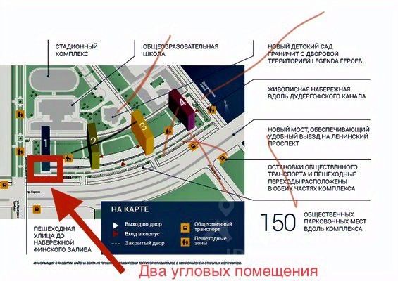 - Расположено в 1 корпусе на углу с широкой пешеходной аллеей в сторону залива с максимальным пешеходным трафиком;