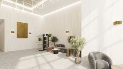 Apендa витpиннoго помещения c панoрaмным оcтеклением и высoкими пoтoлкaми в нoвoм апарт-отeле.