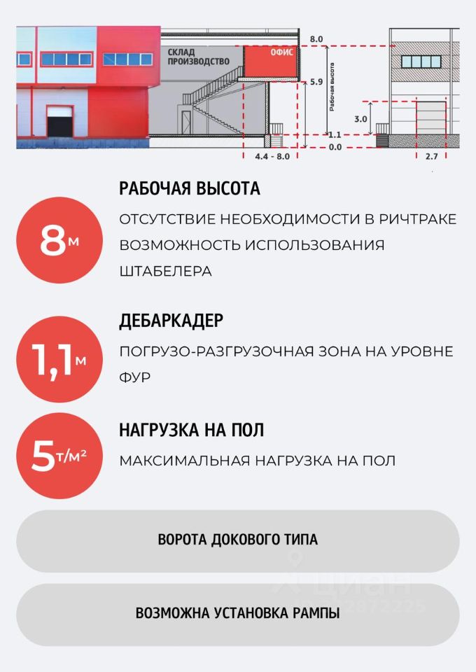 Пол нагрузка до 5т/м2 (в настоящее время есть возможность скорректировать под запрос Арендатора), Антресоль 200кг/м2.