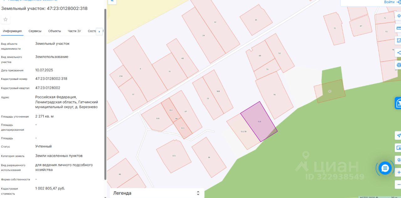 Земельный участок с кадастровым номером 47:23:0128002:318, площадью 2271 (две тысячи двести семьдесят один) кв.м., расположен по адресу: Российская Федерация, Ленинградская область, Гатчинский муниципальный округ, д. Березнево. Категория земель: земли населенных пунктов. Разрешенное использование: для ведения личного подсобного хозяйства. Граница земельного участка установлена в соответствии с требованиями земельного законодательства. Сведения об обременениях: не установлены.