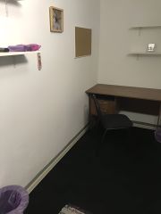 Жку включены. Установлены стол, стул, есть полка. Стеллажей нет. Электроэнергии нет. Свет есть.