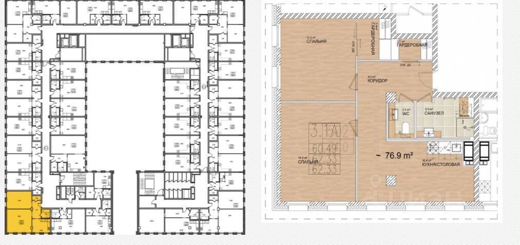 • В помещении кухонный гарнитур, гардероб, полноценный с/у и ванная комната.