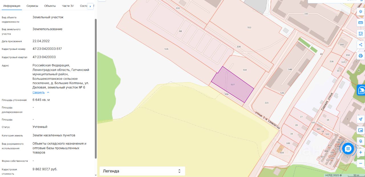 Земельный участок с кадастровым номером 47:23:0420003:517, площадью 6645 (шесть тысяч шестьсот сорок пять) кв.м., расположенный по адресу: Российская Федерация, Ленинградская область, Гатчинский муниципальный район, Большеколпанское сельское поселение, д. Большие Колпаны, ул. Деловая, земельный участок 6. Категория земель: земли населенных пунктов. Разрешенное использование: объекты складского назначения и оптовые базы промышленных товаров. Граница земельного участка установлена в соответствии с требованиями земельного законодательства. Сведения об обременениях:: - смотри "Извещение" + градостроительный план, размещенные в разделе "Документы".