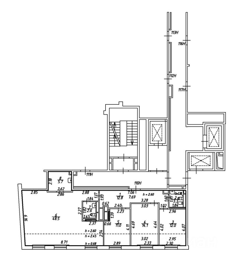 На 8 этаже - четыре светлых кабинета, есть кладовая и кухня с мебелью, два санузла, переговорная комната.