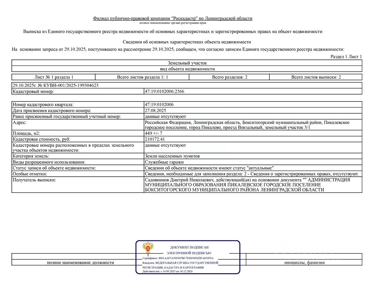 Продажа права на заключение договора аренды земельного участка с кадастровым номером:47:19:0102006:2366, общей площадью 449кв.м., по адресу: Ленинградская область, Бокситогорский муниципальный район, Пикалевское городское поселение, г. Пикалево, проезд Вокзальный, земельный участок 3/1, с видом разрешенного использования: "Служебные гаражи"