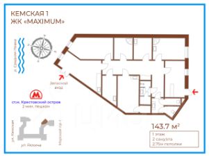 Объект расположен на первом этаже жилого комплекса "Maximum" и занимает площадь в 143,7 квадратных метра. Высота потолков составляет 2,75 метра, а электрическая мощность 30 кВт. Большие панорамные окна в холле обеспечивают обилие естественного света, что делает это помещение идеальным для комфортной работы администратора и встречи гостей.