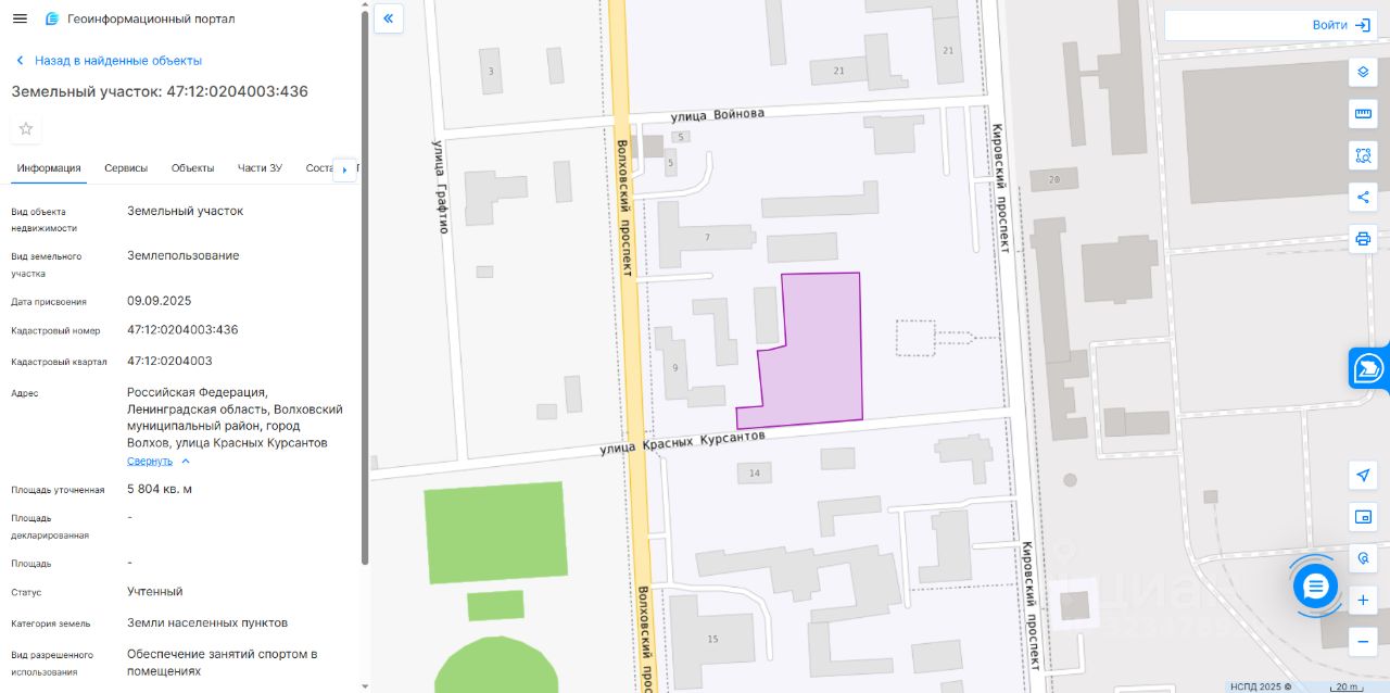Земельный участок с КН 47:12:0204003:436, расположенный по адресу: Ленинградская область, Волховский муниципальный район, г. Волхов, ул. Красных Курсантов площадью 5804 в.м, разрешенное использование - обеспечение занятий спортом в помещениях. Сведения о частях земельного участка и обременениях: часть земельного участка площадью 27 кв.м - охранная зона объекта электросетевого хозяйства "КЛ-0,4 кв от РП-2".
