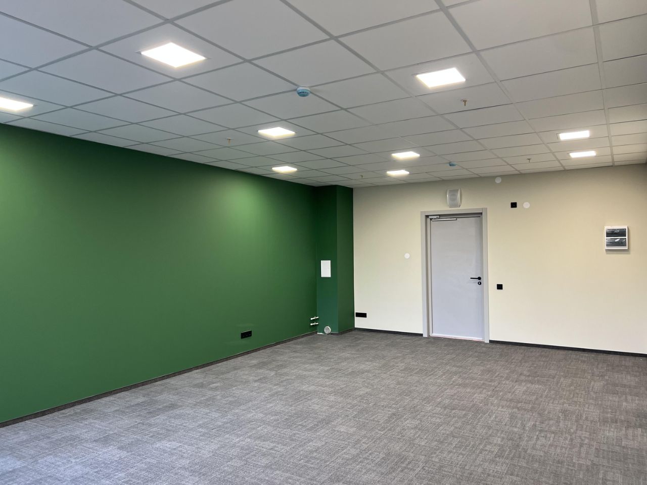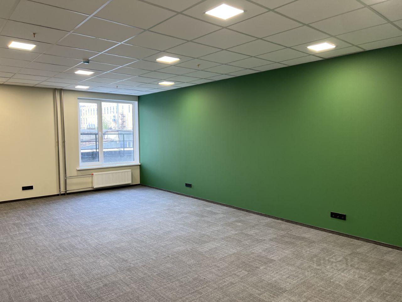 Удобная прямоугольная планировка. Есть мокрая зона для подключения сантехники, ковровое покрытие обеспечивает звукоизоляцию.
