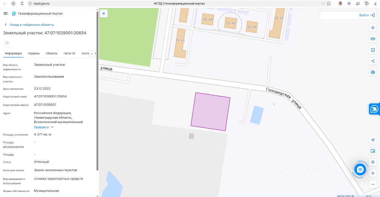 Земельный участок с кадастровым номером: 47:07:1039001:20654, площадью 4377 кв.м., категория земель - земли населенных пунктов, вид разрешенного использования - стоянка транспортных средств.