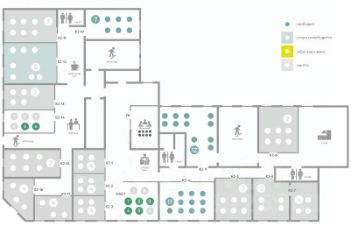 Есть оборудованная кухня, санузлы, переговорные комнаты, зона отдыха и ресепшн.