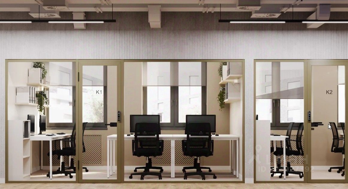 Пространство уже оборудовано всей необходимой мебелью - функциональные рабочие столы, офисные кресла, места хранения для документов.