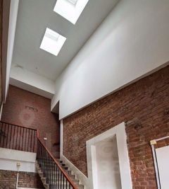Пространства отличаются высокими потолками и большим количеством окон, обеспечивающих естественное освещение.