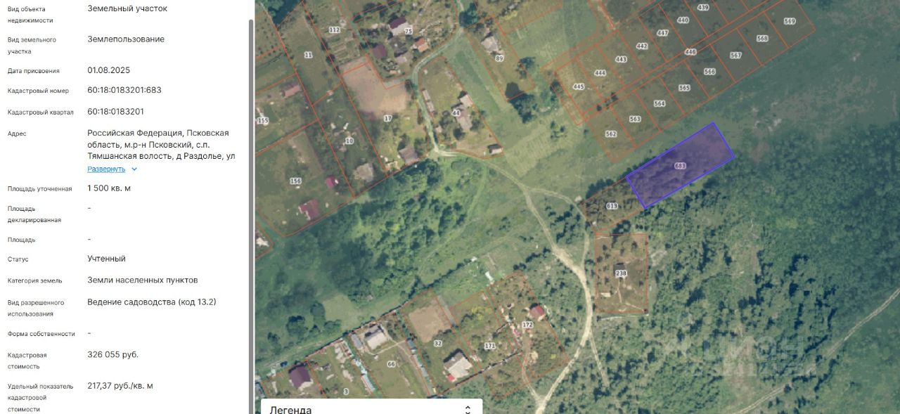 Земельный участок с КН 60:18:0183201:683, площадью 1500 кв.м, с местоположением: Псковская область, Псковский муниципальный округ, д. Раздолье, ул. Цветочная, з/у 31, с видом разрешенного использования "ведение садоводства"