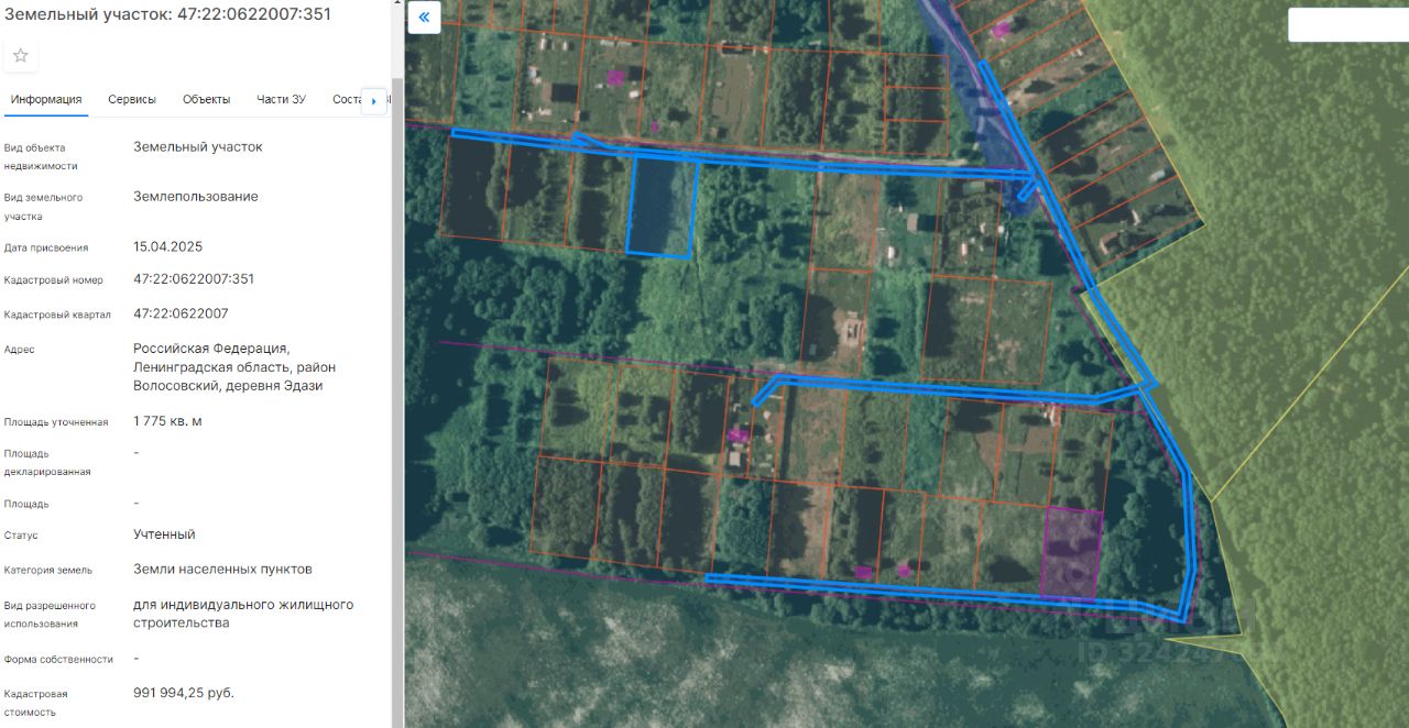 Земельный участок с кадастровым номером 47:22:0622007:351, площадью 1775 кв.м.