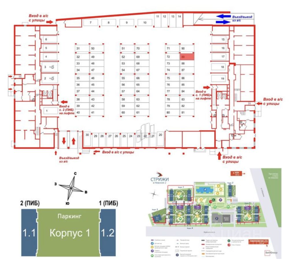 Место рядом с входом в лифтовые первой парадной. Тажке из паркинга есть выход во вторую парадную, на улицу рядом с воротами и на улицу в северо-западном углу дома (в сторону второй парадной дома Железнодорожный проспект 14 к3). Доступ в паркинг из двух парадных, не выходя на улицу + с улицы с двух сторон дома.