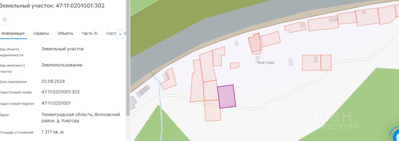 Земельный участок с кадастровым номером 47:11:0201001:302, площадью 1317 кв.м., расположенный по адресу: Ленинградская область, Волховский район, д. Кивгода, с разрешенным использованием ведение личного подсобного хозяйства.