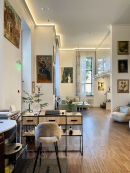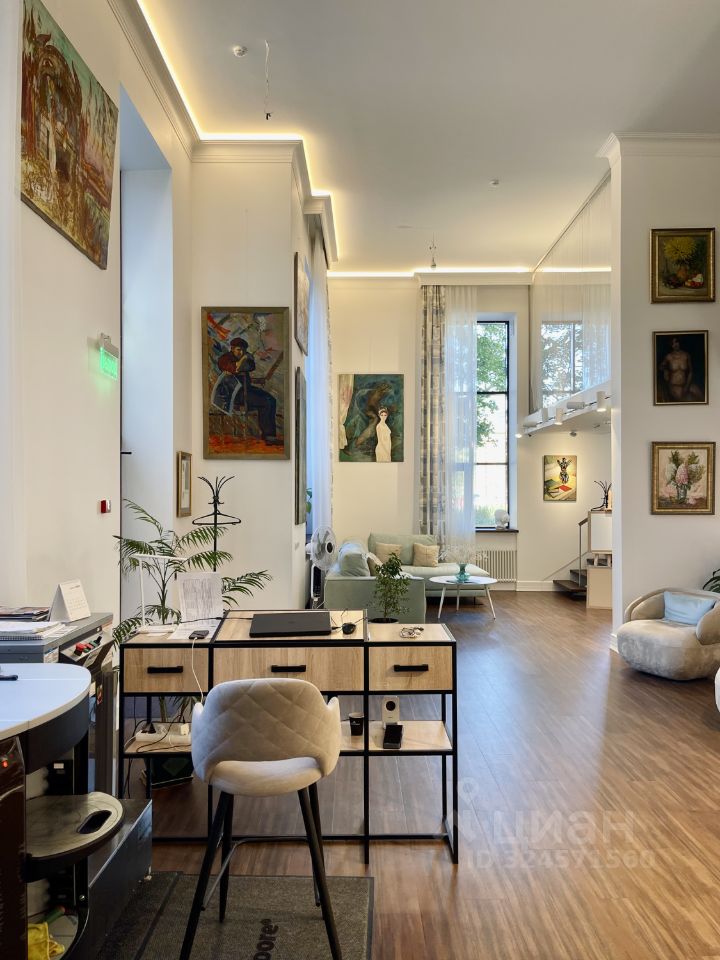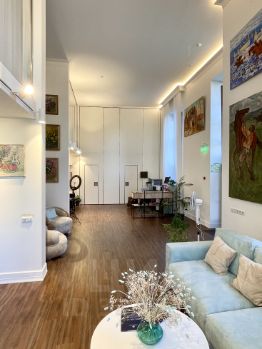 Очень высокие потолки 5.4 м., что даёт потрясающий дневной свет. Над частью помещения размещена антресоль, где поместились: рабочий кабинет и место секретаря. Выполнен высококачественный ремонт в светлых тонах.