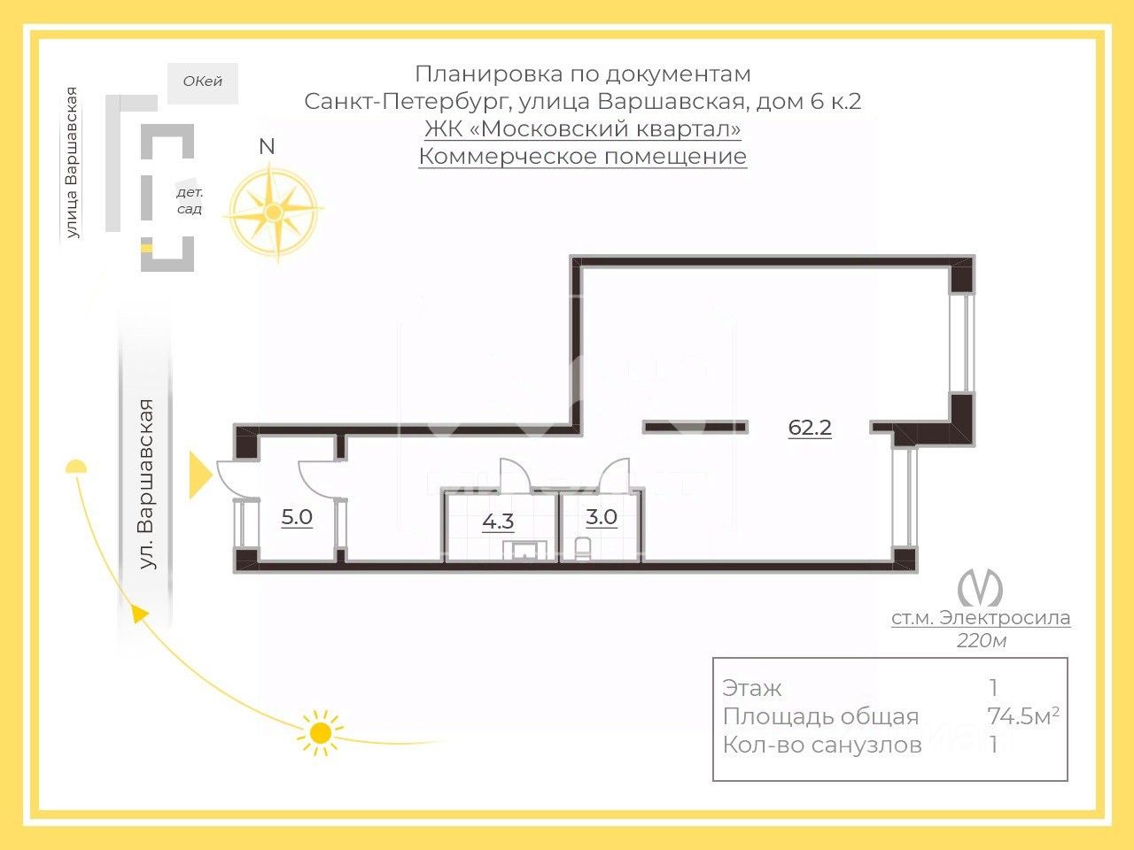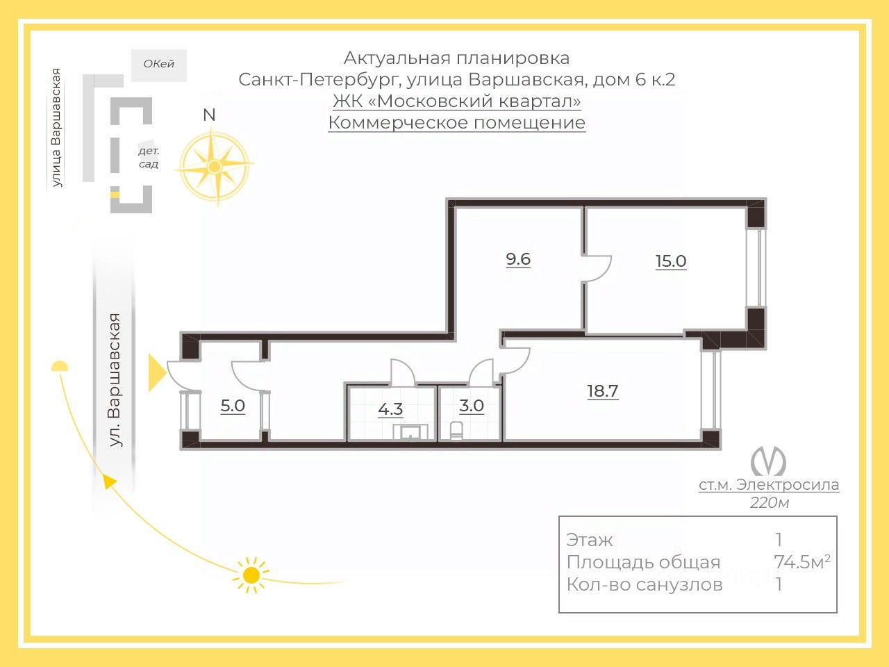 Помещение находится в Жилом комплексе "Московский квартал", недалеко от станции метро "Электросила", Многофункциональный жилой комплекс бизнес-класса вмещает в себя 1600 квартир.