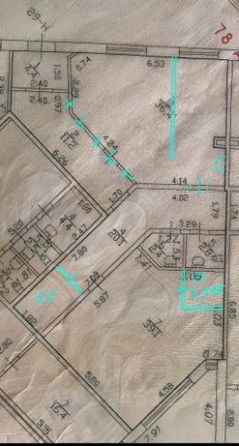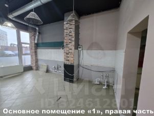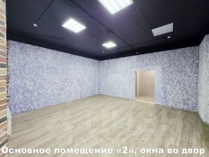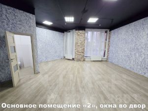 - Первое основное помещение 11.2+36.4=47.6м, два витринных окна на проспект, есть точка подключения воды и канализации. Разделено временной перегородкой, которую можно убрать. Два выхода в коридор.
