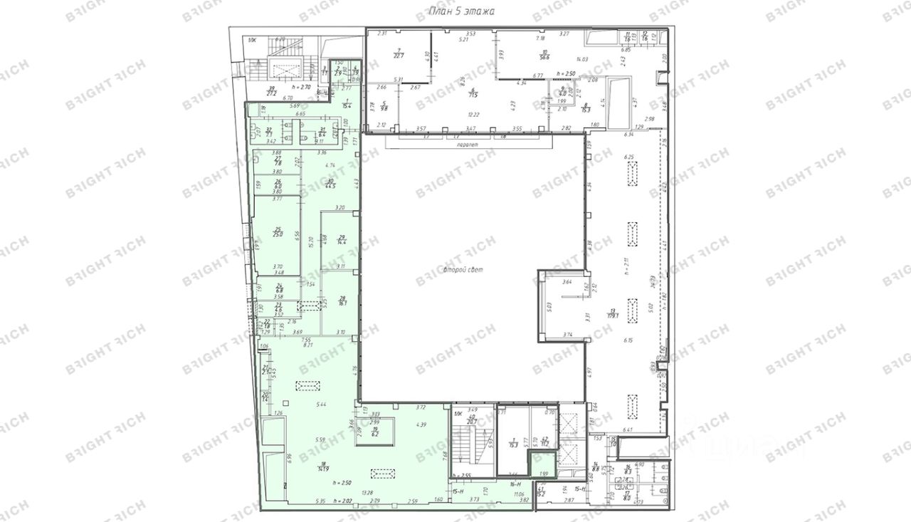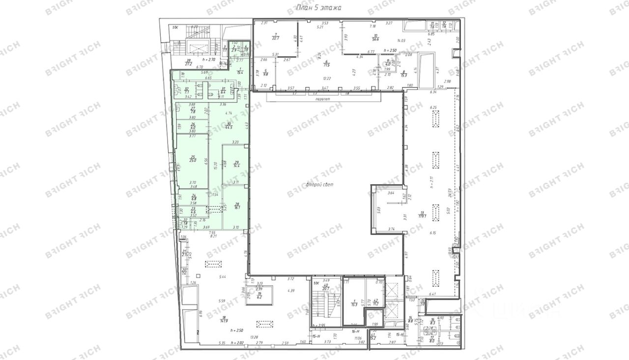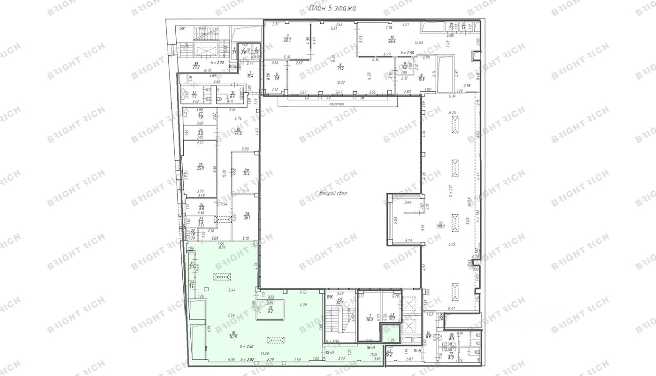 Офисный блок 325,3 м² расположен на 5 этаже. Планировка смешанная: open space, кабинеты, кухня и собственный с/у. Возможно деление блока на 169,3 и 198,2 м².