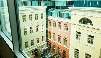 В бизнес-центре развитая инфраструктура: два ресторана, столовая, кофейня, отделения банков, банкоматы, визовый центр. Напротив расположен Казанский сквер — отличное место для прогулок и отдыха летом.