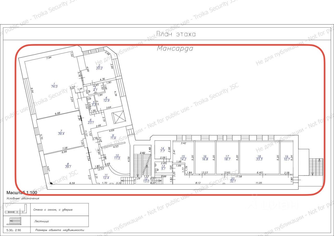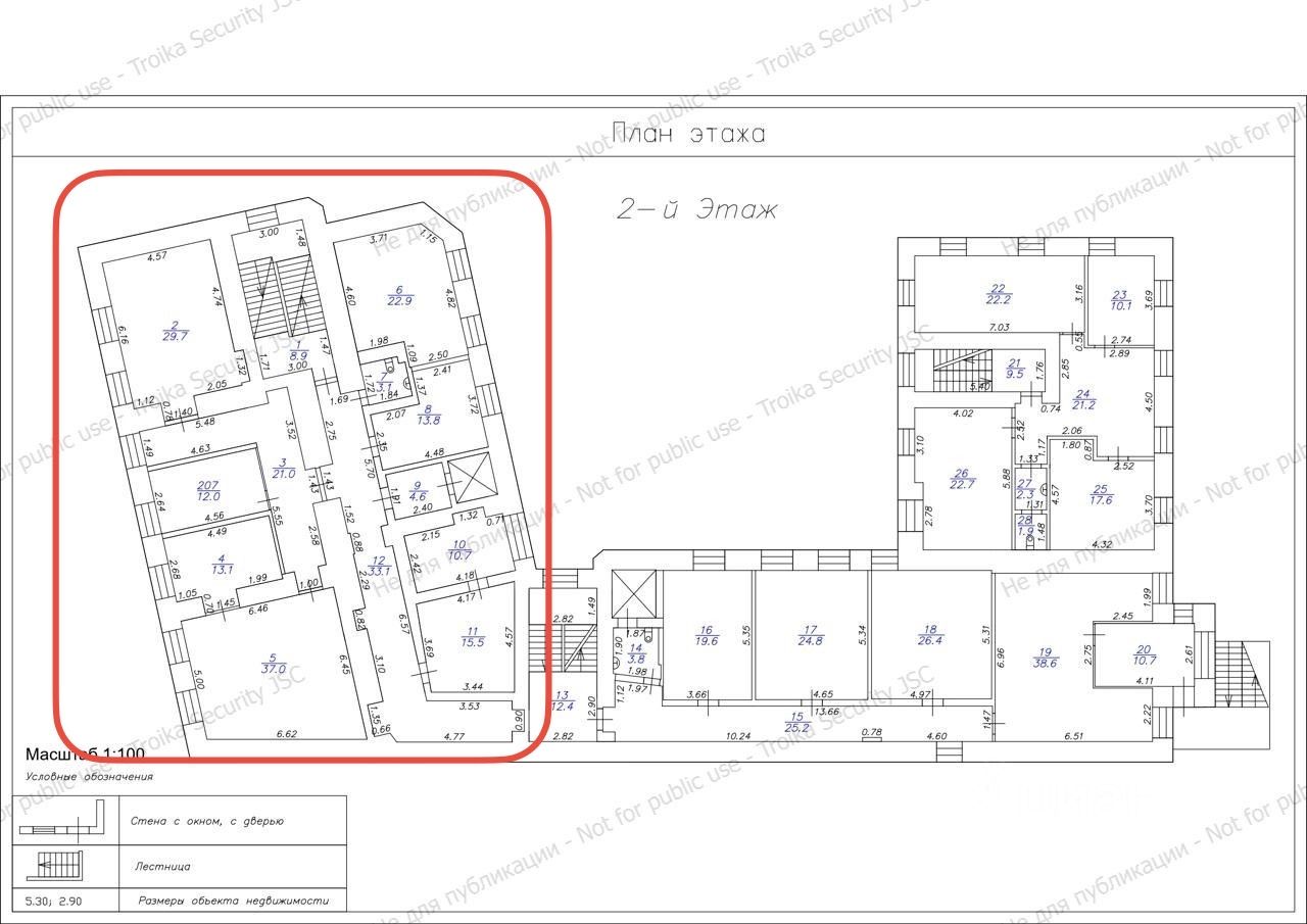 Часть здания имеет 4 этажа и цоколь. Планировка разнообразная от коридорно-кабинетной до open space. На первом этаже просторные залы и кабинеты, второй и третий этаж имеют коридорно-кабинетную эргономичную планировку. Просторные помещения с высокими потолками и большим количеством окон, из которых открываются прекрасные виды. Четвертый этаж представляет собой панорамную и светлую мансарду с современным качественным ремонтом. На цокольном этаже расположены несколько складских помещений, а также бомбоубежище, которое может быть эффективно использовано. На каждом этаже имеется санузел.
