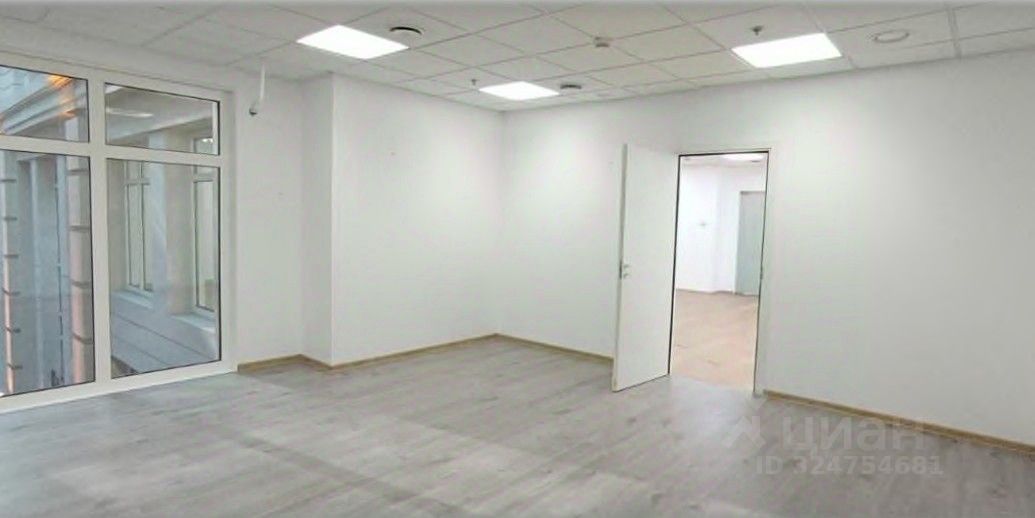 Два входа в Помещение, окна в пол, фальшпол.