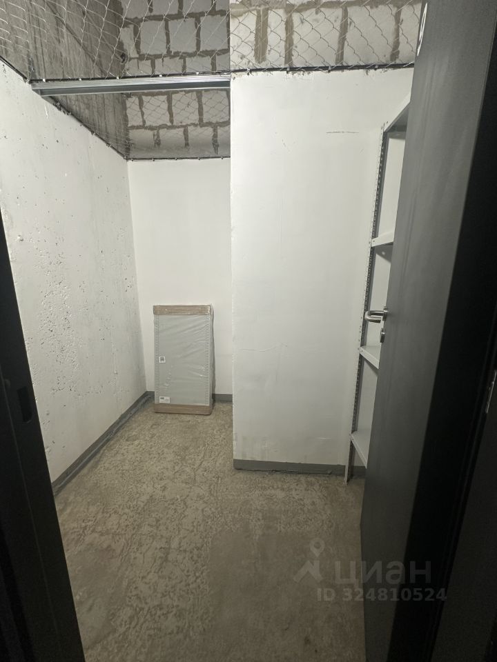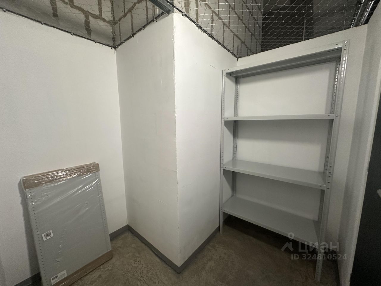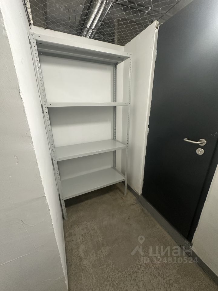 Кладовое помещение в новом доме. Угловое, удобно размещены стеллажи.