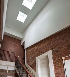 Пространства отличаются высокими потолками и большим количеством окон, обеспечивающих естественное освещение.