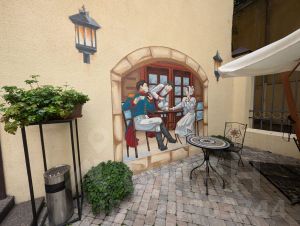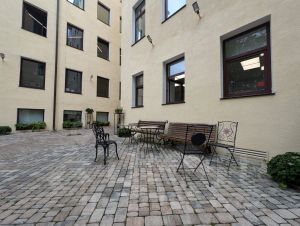 Оборудованная зона отдыха во дворе на улице, где можно выпить чашку ароматного кофе
