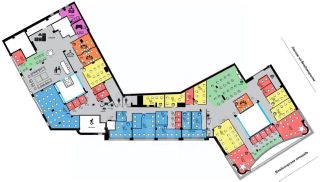 Есть оборудованная кухня, переговорные комнаты, зоны отдыха и ресепшн, гардеробная, санузлы.