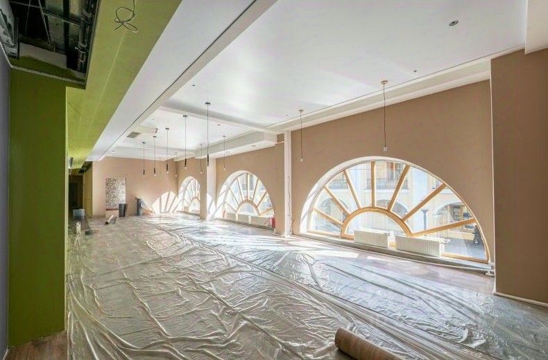 Описание помещения: Пространства достаточно, чтобы оборудовать большое количество кабинетов. Окна в виде полусолнца по периметру.