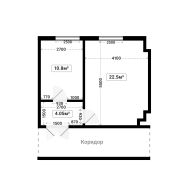 -- Квадратное помещение, разделенное на три комнаты (прихожая - 4.2 м2, комната - 10.8 м2, комната - 22.5 м2)