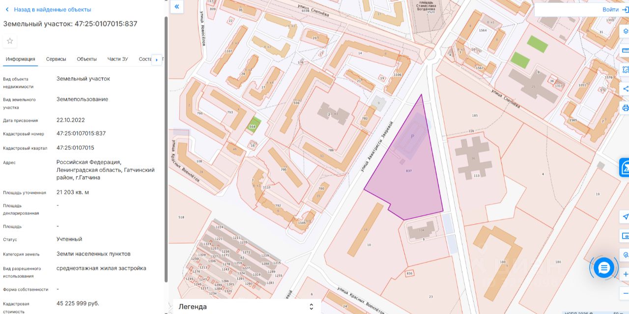 Земельный участок с кадастровым номером 47:25:0107015:837, площадью 21203 (двадцать одна тысяча двести три) кв.м., расположенный по адресу: Российская Федерация, Ленинградская область, Гатчинский район, г. Гатчина. Категория земель: земли населенных пунктов. Разрешенное использование: среднеэтажная жилая застройка. Граница земельного участка установлена в соответствии с требованиями земельного законодательства. Сведения об обременениях: - смотри "Извещение" + градостроительный план, размещенные в разделе "Документы".