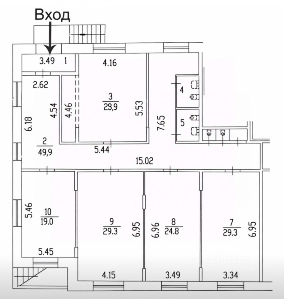 Помещение общей площадью 188 кв. м., расположено на 1 этаже, имеет два отдельных входа, состоит из нескольких кабинетов, есть зона ресепшн, четыре с/у. Роллеты на окнах. Помещение просторное, светлое.