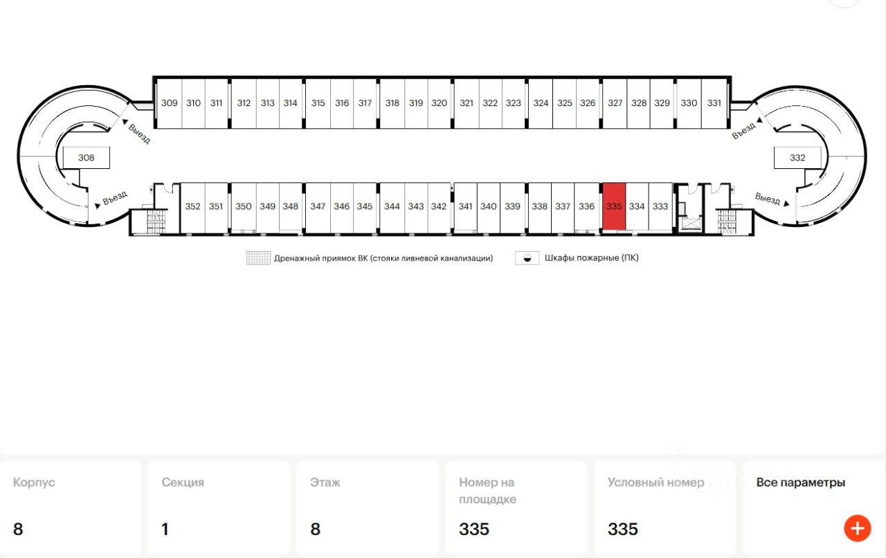 Место угловое, расположено на 8-м уровне близ въезда/выезда и лифта.