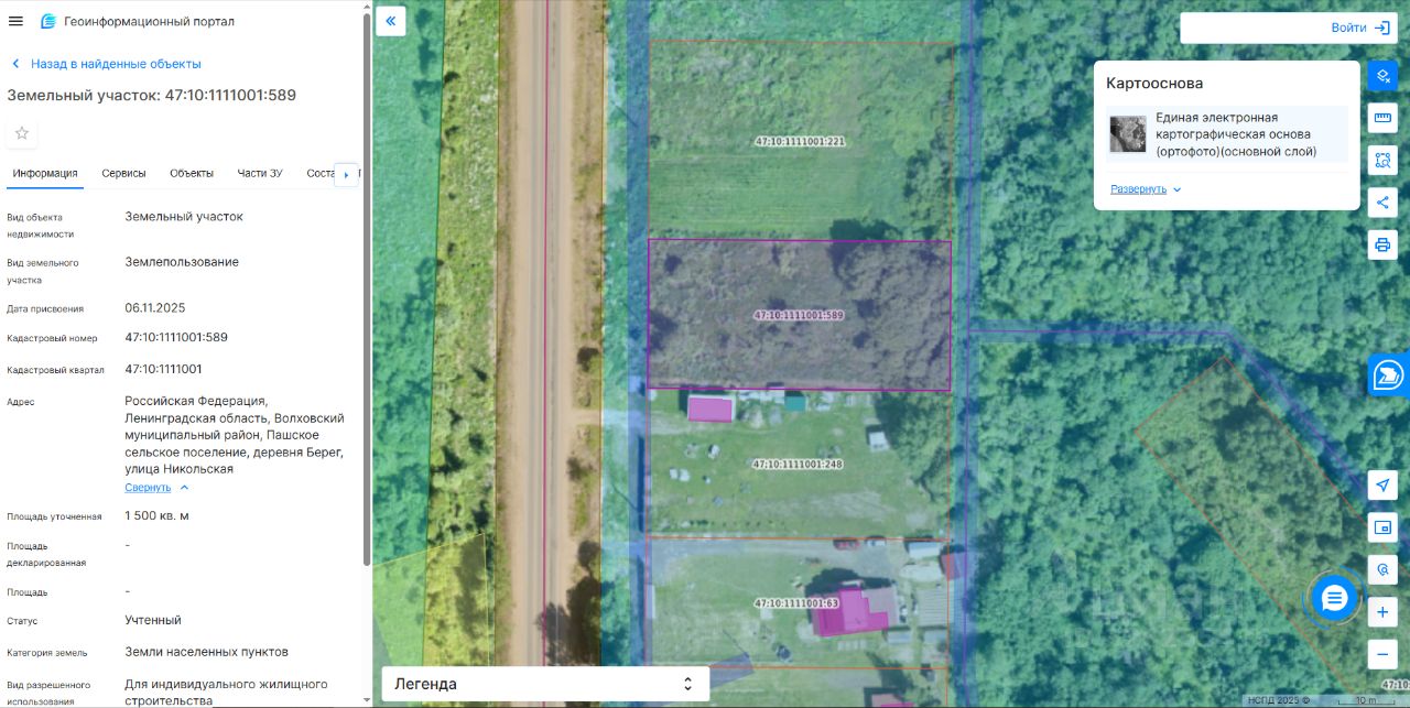 Земельный участок с кадастровым номером 47:10:1111001:589 площадью 1500 кв.м, разрешенное использование для индивидуального жилищного строительства, расположенный по адресу: Ленинградская область, Волховский муниципальный район, Пашское сельское поселение, дер. Берег, ул. Никольская.