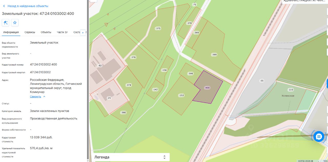 Земельный участок с кадастровым номером 47:24:0103002:400, площадью 22860 (двадцать две тысячи восемьсот шестьдесят) кв.м., расположенный по адресу: Российская Федерация, Ленинградская область, Гатчинский муниципальный округ, город Коммунар. Категория земель: земли населенных пунктов. Разрешенное использование: производственная деятельность. Граница земельного участка установлена в соответствии с требованиями земельного законодательства. Сведения об обременениях: - смотри "Извещение" + градостроительный план, размещенные в разделе "Документы".