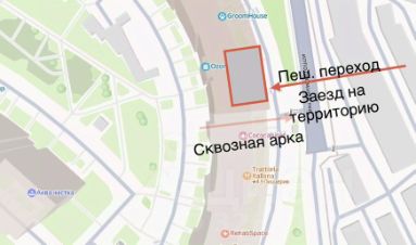 Основной вход и два больших окна смотрят на улицу. Помещение расположено рядом со шлагбаумом въезда на территорию и граничит со сквозной аркой, ведущей во двор.