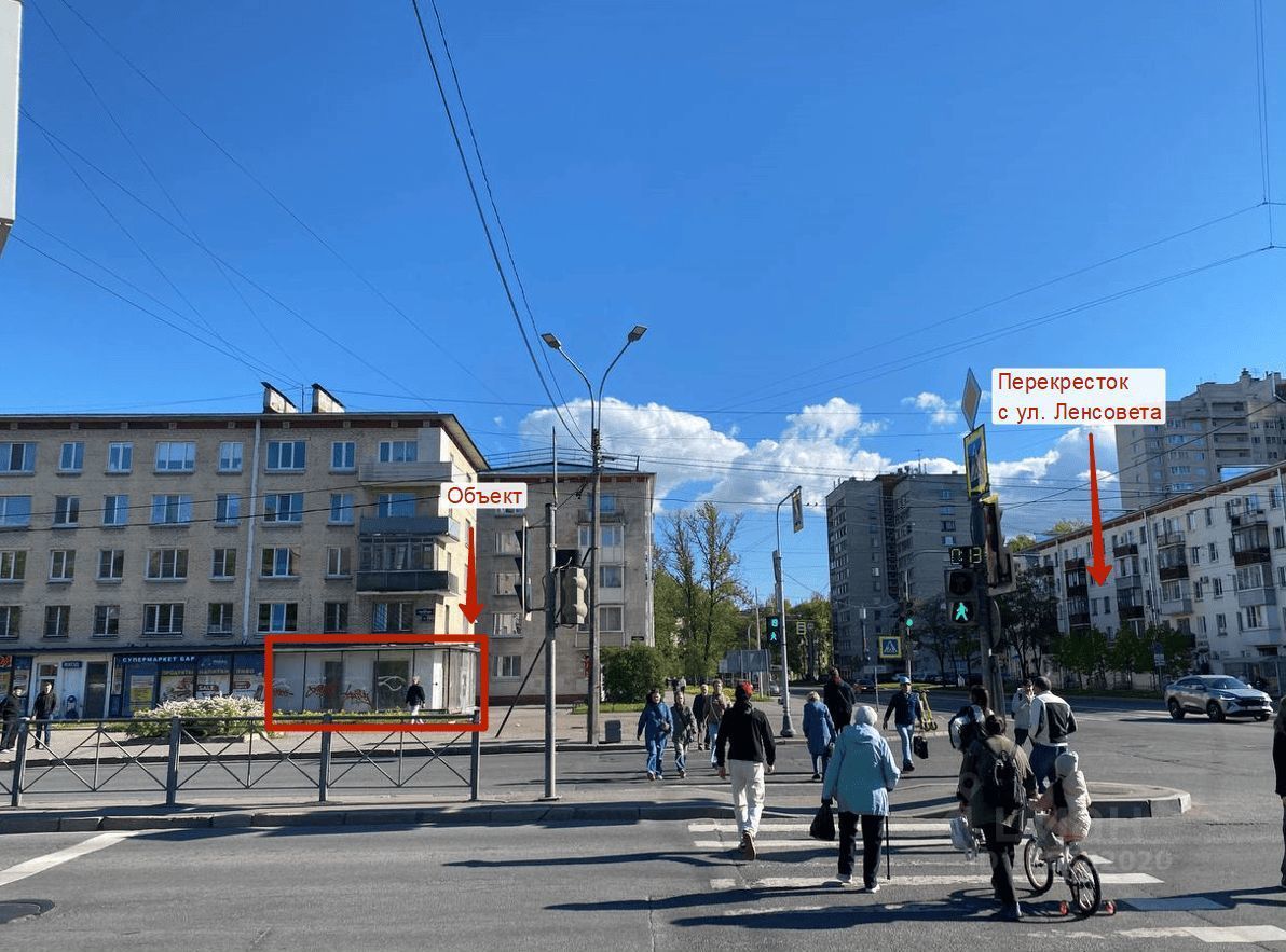 Угловое помещение на перекрестке улиц Ленсовета и Орджоникидзе, вход с Ленсовета, витрины в пол, два пешеходных перехода, ранее была аптека Фармакор.