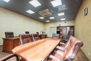 Кабинет с массивными кожаными креслами, мебель в английском стиле, зона переговорной —стол на 6 персон.
