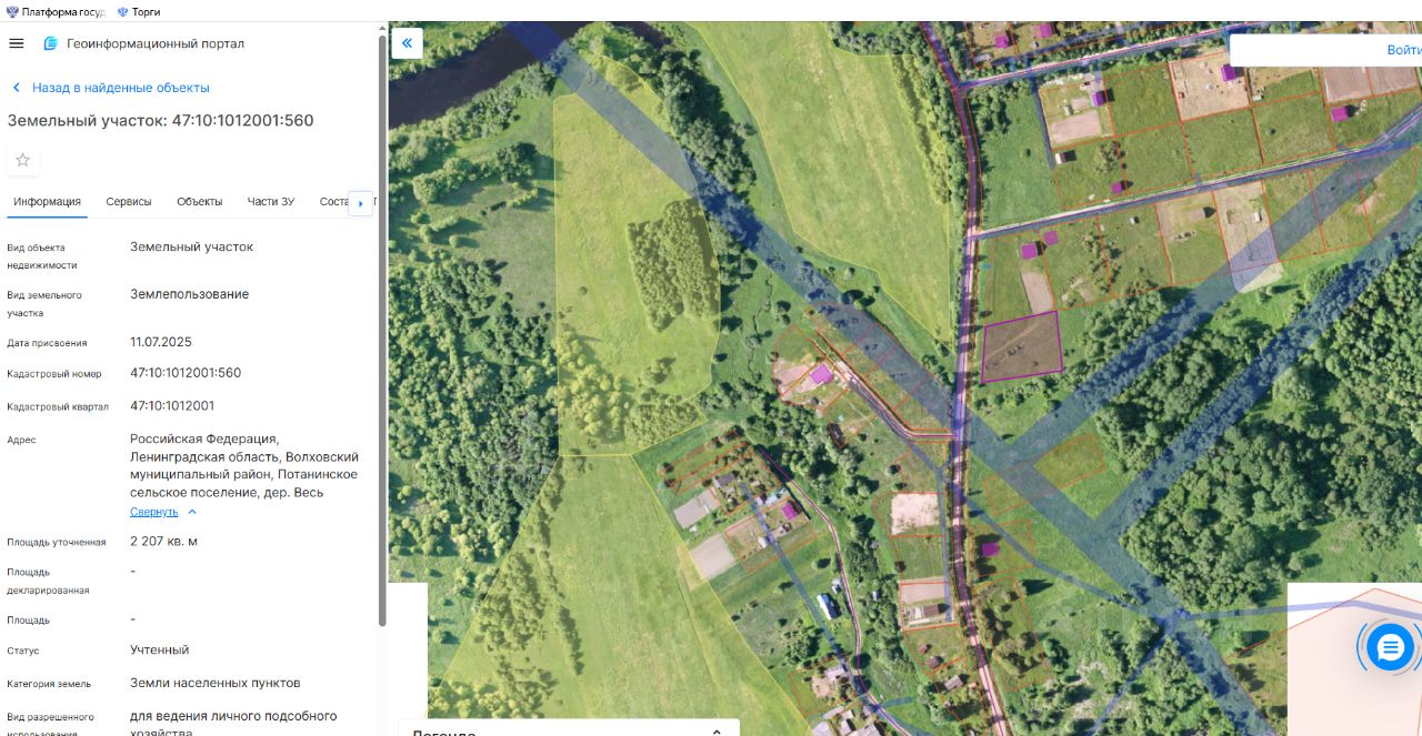 Земельный участок с кадастровым номером 47:10:1012001:560 площадью 2207 кв.м, разрешенное использование для ведения личного подсобного хозяйства, расположенный по адресу: Ленинградская область, Волховский муниципальный район, Потанинское сельское поселение, дер. Весь.