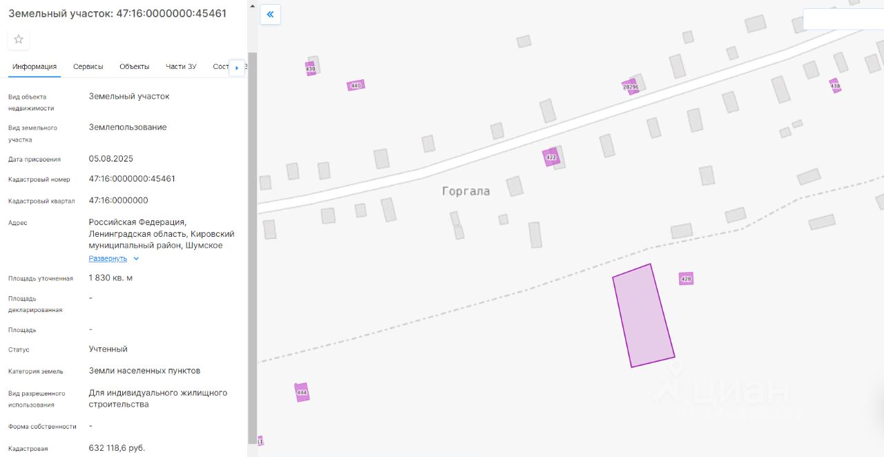 Площадью 1830 кв.м., кадастровый номер 47:16:0000000:45461