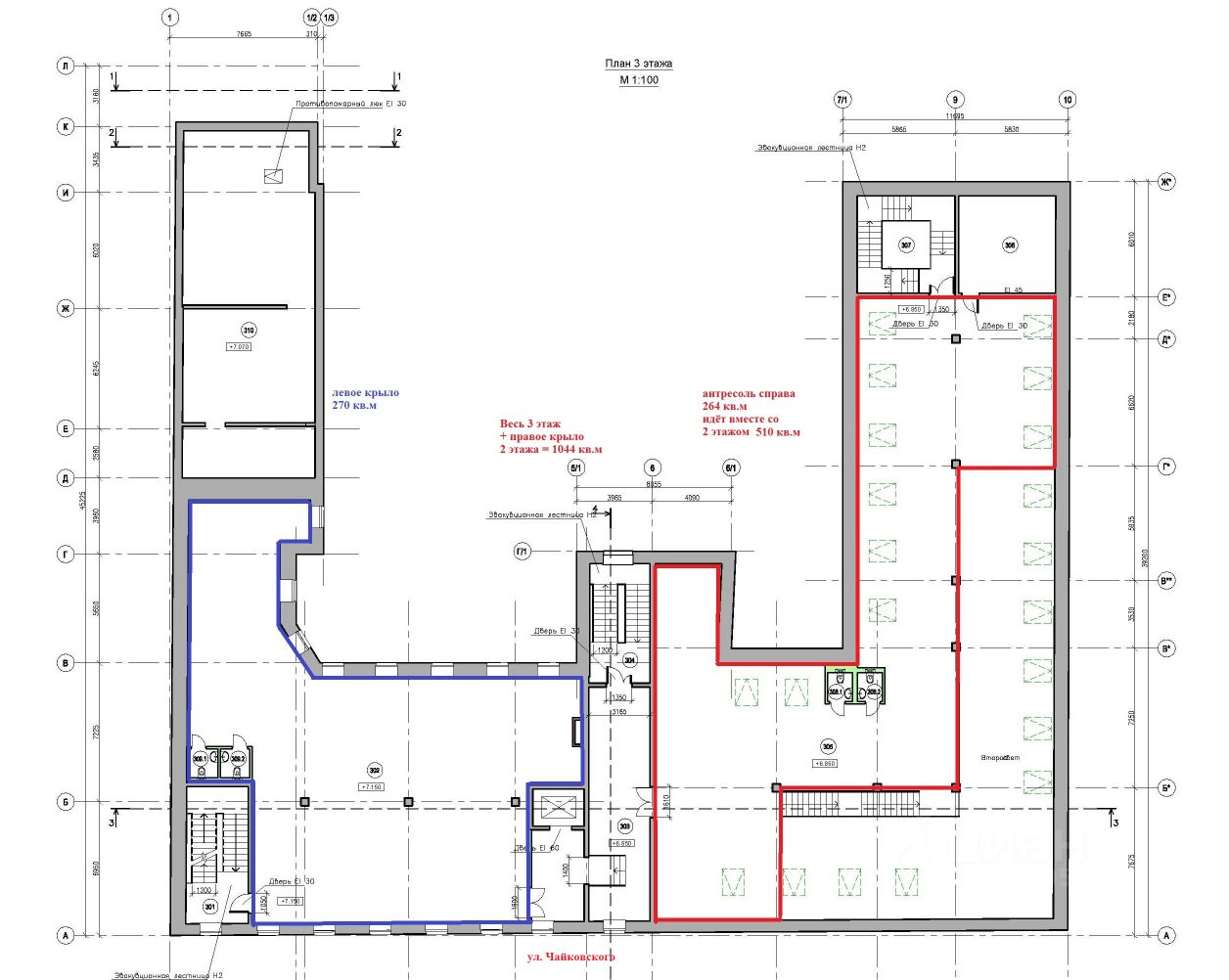 На 1 этаже торговые площади с ул. Чайковского: 124 кв.м, 71 кв.м и 68 кв.м цена за 1 кв.м = 6000 руб.